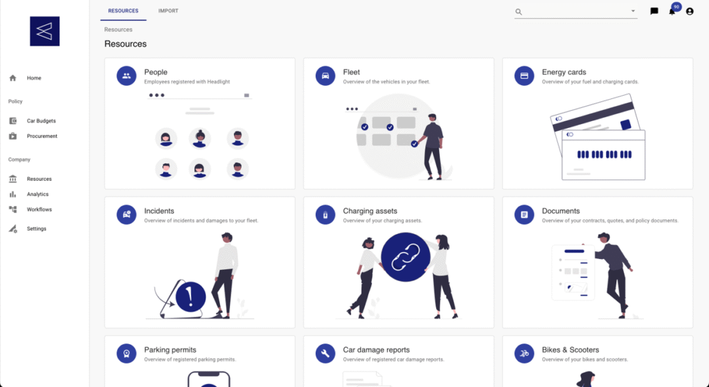 Binnen Headlight kunnen alle mobiliteitsoplossingen beheerd worden. Niet enkel wagens dus, maar ook fiets, laadpalen, parkingabonnementen, treinabonnenten, schade- en boetebeheer, … alles is op te volgen.