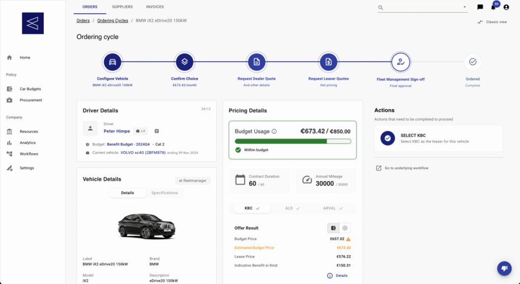 De data van de wagens (eventueel ook van andere oplossingen) komt rechtstreeks vanuit de leasemaatschappijen. Het is dus niet meer nodig om alles zelf in te geven, de data zet zichzelf up to date. Ook makkelijk om de reeds bestelde wagens op te volgen.